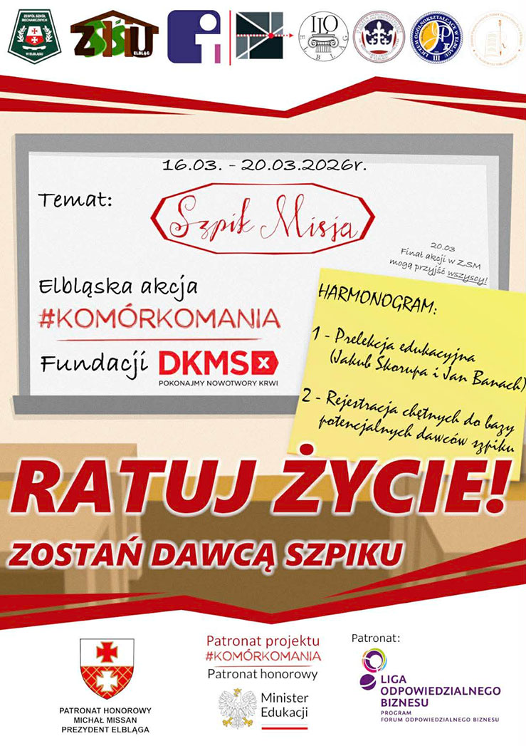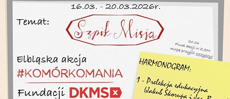 W dniach 16–20 marca 2026 r. w ośmiu elbląskich szkołach ponadpodstawowych realizowana będzie akcja „Szpik Misja – Elbląska akcja #KOMÓRKOMANIA Fundacji DKMS”. Projekt ma charakter miejski i jest koordynowany na poziomie samorządowym.